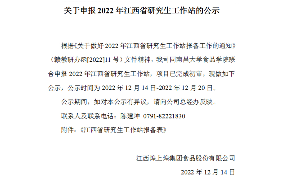 根據《關于做好2022年江西省研究生工作站報備工作的通知》(贛教研辦函[2022]11號)文件精神,我司同南昌大學食品學院聯合申報2022年江西省...
